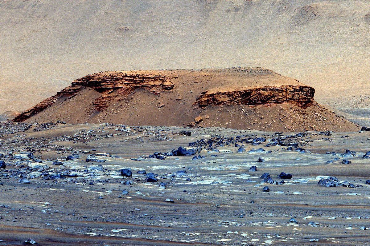 تصویر پرسویرنس از صخره مورد در لبه دهانه یزرو ؛ سنگهای بزرگتر در بالای صخره خبر از وقوع سیل در گذشته احساسده