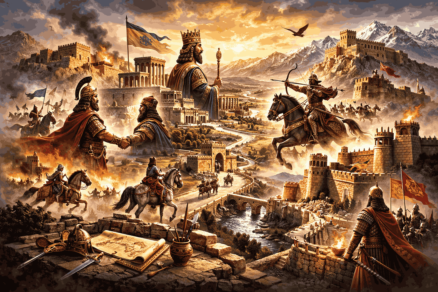 این ترکیب را میشود در چهره چند پادشاه فاتح و اثرگذار دید: هووَخشتره (کیاکسار) که با سیاستِ اتحاد، کفه ترازو را علیه دشمنِ برتر سنگین کرد؛ کوروش بزرگ که با تدبیر و جسارت، از دلِ فلات ایران یک قدرت فراگیر ساخت؛ داریوش یکم که نظم اداری و توان بسیج را به ستون فقرات امنیت تبدیل کرد؛ مهردادِ اشکانی که با عمق راهبردی و مدیریت مرزهای غربی، میدان را از «جنگِ مستقیم» به «موازنه» کشاند؛ و شاپور اول و خسرو انوشیروان که نشان دادند پیروزی فقط در حمله نیست—گاهی در اصلاح، سازمان، و ساختن مرزهای نفوذناپذیر است.
