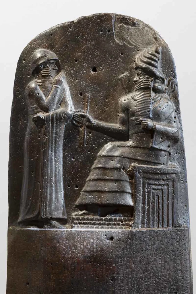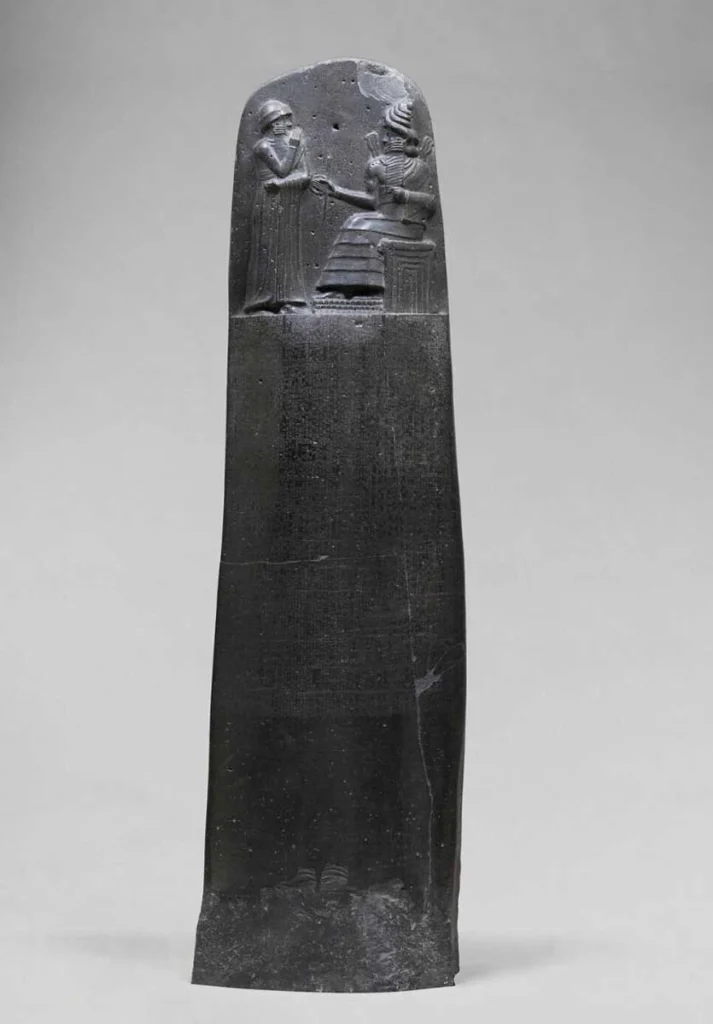 قانون حمورابی بر روی یک بنای یادبود بازالتی به ارتفاع ۷ فوت کشف شد. این اثر که بین سالهای ۱۷۵۵ تا ۱۷۵۱ پیش از میلاد حک شده است، ۲۸۲ قانون را فهرست میکند و نشان میدهد که پادشاه حمورابی آنها را از خدای باستانی بینالنهرین، شمش، دریافت میکند و به قانون جدید وزن الهی میبخشد. قطعاتی از حداقل دو بنای سنگی مشابه دیگر که متن مشابهی دارند، کشف شده است که نشان میدهد این قانون در شهرهای اطراف امپراتوری بابل به نمایش گذاشته شده است.