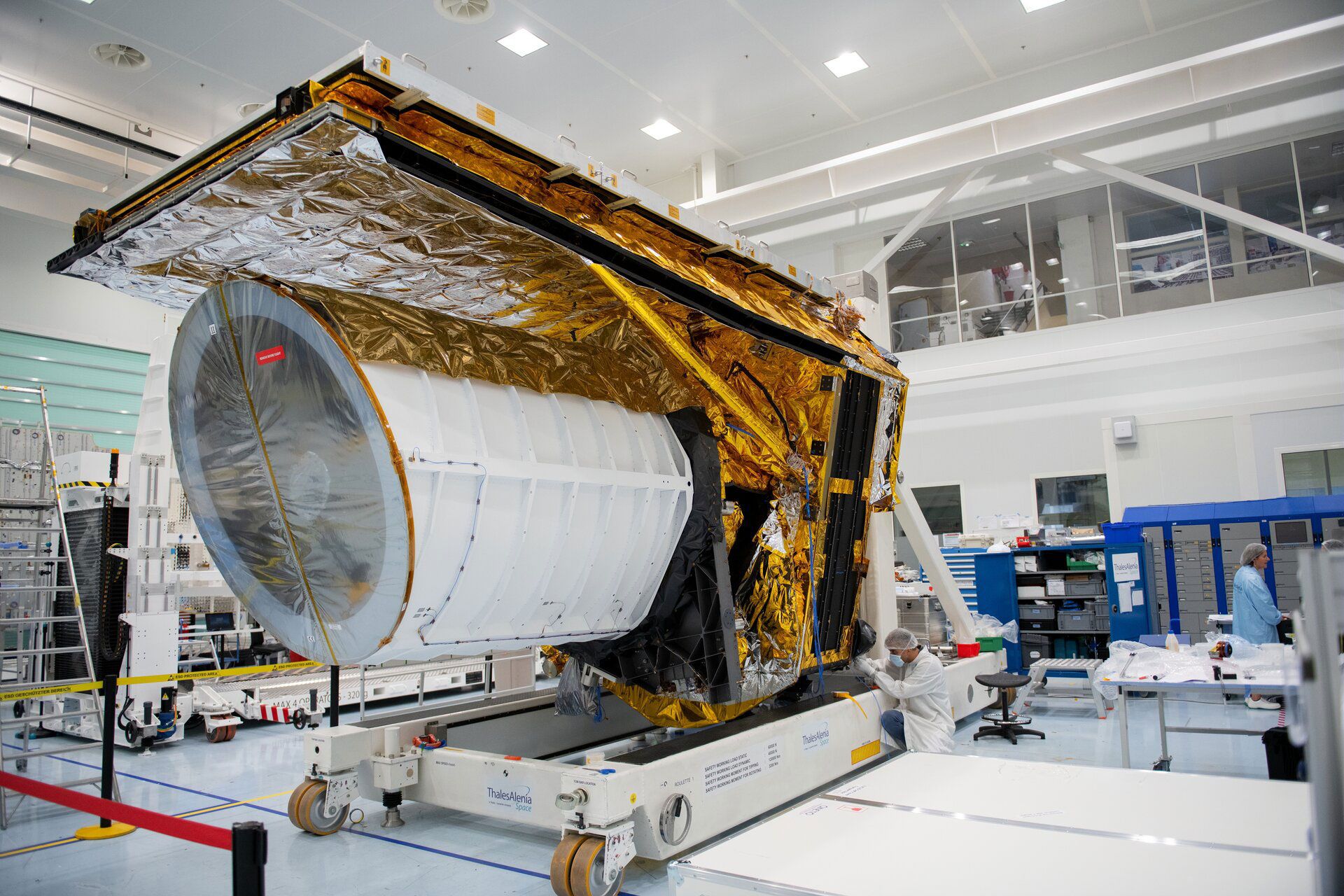 دانشمندان برای اطمینان از عملکرد صحیح و سالم ماندن تلسکوپ در طول سفر فضایی با موشک روسی سایوز، آن را لرزاندند تا واکنش قطعات را ببینند. کابل‌هایی که در تصویر فوق می‌بینید، به شتاب‌سنج‌هایی وصل هستند که این لرزش‌ها را به‌وجود می‌آورند. موسی می‌گوید: